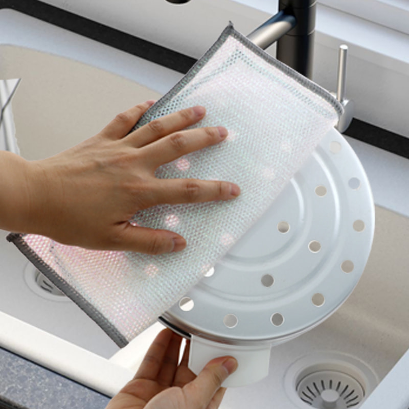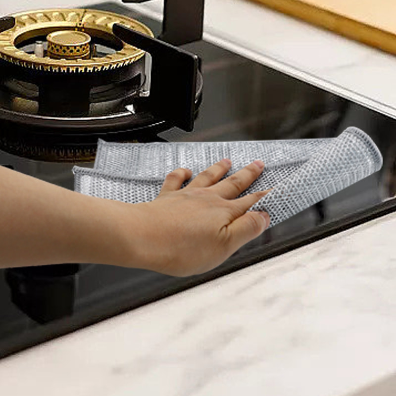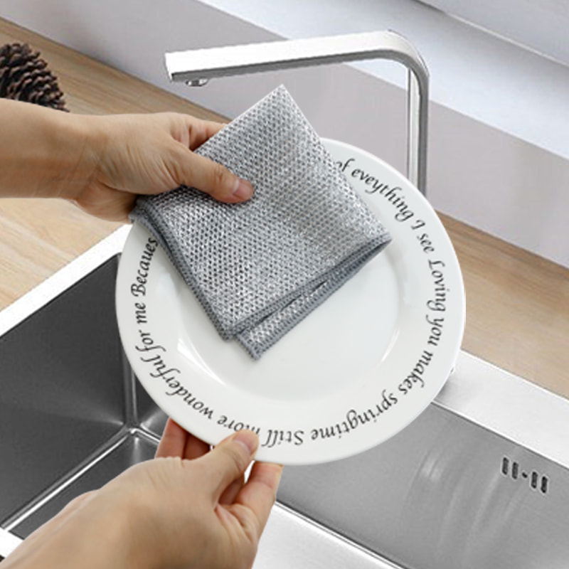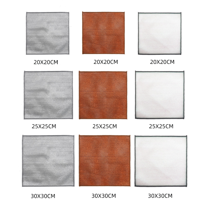 ผ้าเช็ดจานลวดเงินสองหน้า ทำจากไหมทองสัมฤทธิ์ ซึ่งมีราคาแพงมาก ไม่เคลือบ ไม่แป้ง ไม่ซีดจาง; ไม่มีน้ำมัน ไม่มีน้ำมัน ขูดแรงแต่ไม่ทำให้เครื่องครัวเสียหาย ทำจากผ้าไหมสีสันสดใส มีความมัน และไม่เหนียวเหนอะหนะ มีมูลค่ารูปลักษณ์สูง ไม่มีการเคลือบ ไม่มีผงตก ไม่มีสีซีดจาง; ขูดแรงแต่ไม่ทำให้เครื่องครัวเสียหาย